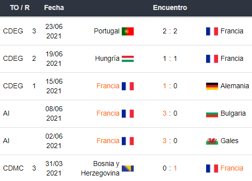 - Francia pasa por un buen momento como equipo y sigue invicta. Ha ganado 1 encuentro y empatado 2.