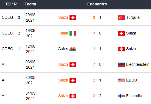 En sus últimos 5 partidos, Suiza ha encontrado la victoria 3 veces, ha empatado un encuentro y perdido otro.