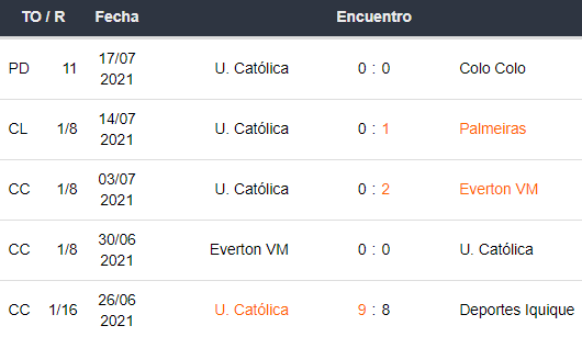 Universidad Católica llega de perder su último encuentro en esta competencia, precisamente ante Palmeiras, en el partido de ida por los octavos de final. Hasta el momento tiene un porcentaje de goles a favor de 1.7 por partido. En el siguiente apartado encontraras una breve recopilación de los pormenores de los últimos 5 partidos donde el equipo ha jugado.