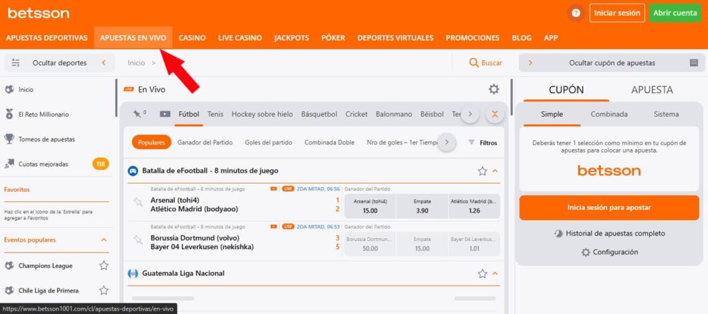 Estos son los pasos básicos para acceder a la sección de apuestas en vivo de Betsson: